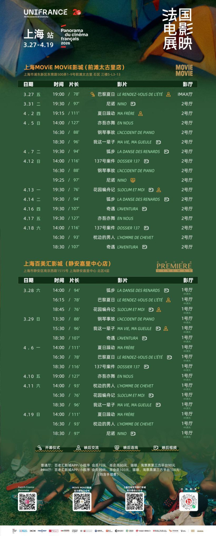 其中,上海站将于3月27日至4月19日在MOViEMOViE影城和百好意思汇影城(静安嘉里中心店)举行,并于3月24日中午12点开票。除了好意思满片单放映,本次上海站展映时分,有多部影片设置重磅映后看成:《巴黎夏日》将由导演瓦伦丁・卡迪奇亲临两场现场考虑;《花圃编舟记》邀请法国影视定约总司理唐莉安、诗东说念主胡桑分辨参与映后;《我这一辈子》邀请海外电影节策展东说念主马可・穆勒对谈;《夏日躁动》由影像艺术家李竞菲到场考虑;《尼诺》安排导演波利娜・洛克线上连线互动。此外,《137号案件》《狐步》《奇遇》等影片也配有映后主创的访谈视频,便于不雅众进一步采集影片。