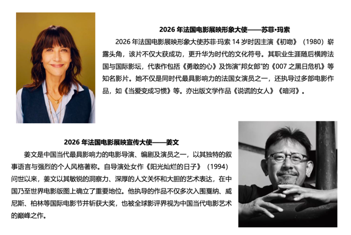 22年来,伊莎贝尔・于佩尔、让・雷诺、朱丽叶・比诺什、蕾雅・赛杜等法国电影东说念主,克洛德・勒卢什等电影大家王人曾通过影展来华;葛优、贾樟柯、陆川、章子怡等中国有名电影东说念主王人曾担任展映代言东说念主,它早已成为中法文化畛域考虑的中枢平台。2026年的光影盛宴特邀苏菲・玛索担任形象大使,姜文担任宣传大使,两位中法影坛的重量级东说念主物携手助阵,为影迷带来一场诚意拉满的法兰西电影之旅。