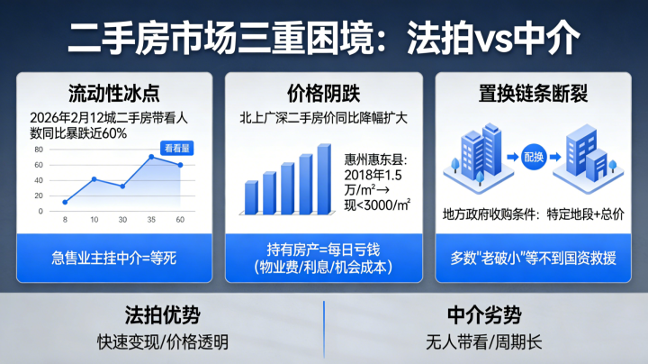 流动性的“冰点”:不是没东谈主念念买房,而是人人皆在不雅望。招商证券的数据清晰,2026年2月,12个样本城市的二手房带看东谈主数同比暴跌近60%。这意味着,即使你赤忱卖房,连上门看房的客户皆莫得。关于急花钱的业主来说,挂在往常中介那边,基本等于“用时辰换可能”。