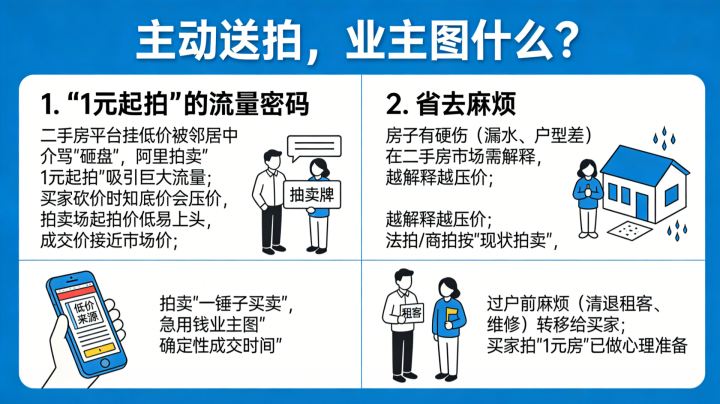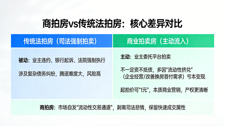 买卖拍卖房(主动流入):是主动的。业主为了快速变现,我方交付平台拍卖。不一定资不抵债,更多是“流动性挤兑”——企业计较要钱、改善换房卡在了首付步调,宁可亏蚀也要把屋子变成现款。起拍价不错“1元”,推行是买卖营销,产权持续比传统法拍房了了。