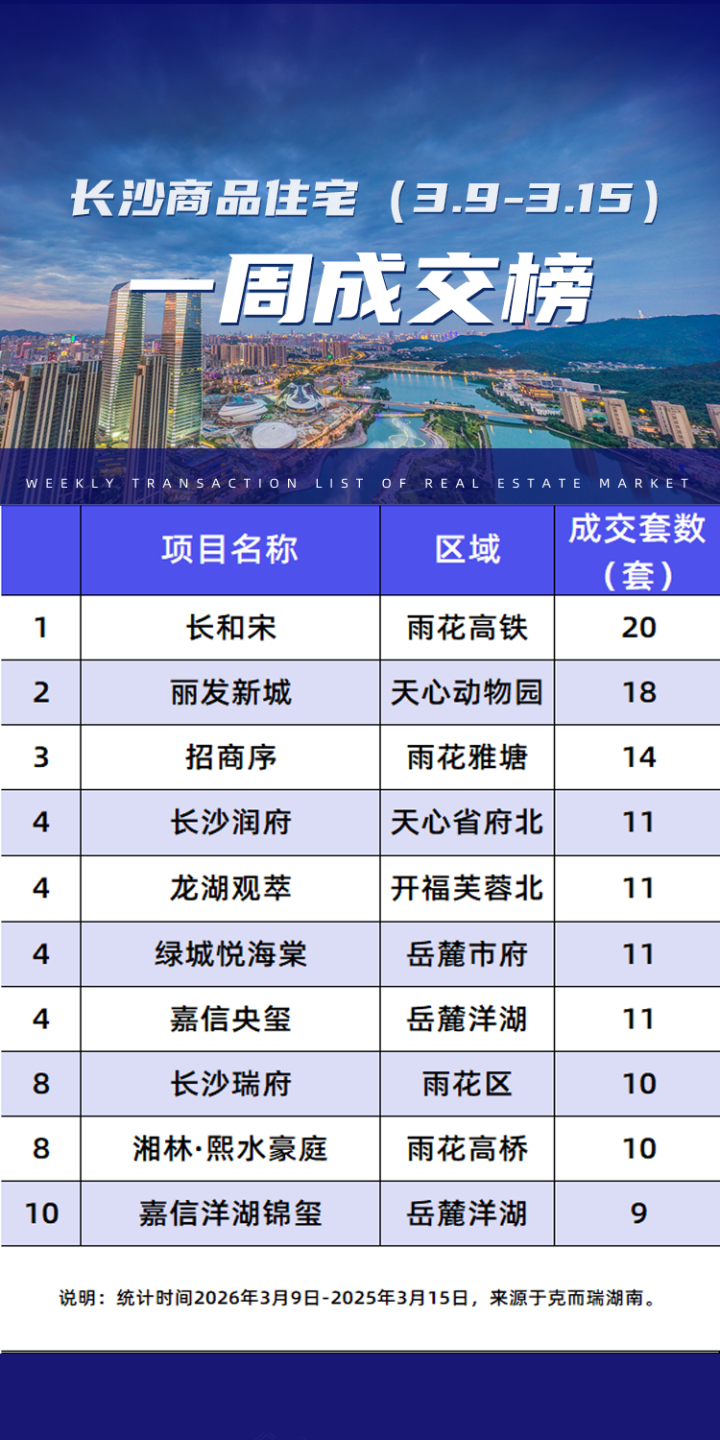 3.9-3.15,长沙内五区哪些楼盘网签成交套数更多?证实克而瑞发布的内五区(含高新区、长沙县托管区域)商品住宅成交榜单败露,长和宋、丽发新城、招商序、长沙润府、龙湖不雅萃、绿城悦海棠、嘉信央玺、长沙瑞府、湘林·熙水豪庭、嘉信洋湖锦玺等10个楼盘上榜。榜首成交套数20套,第十名成交9套。