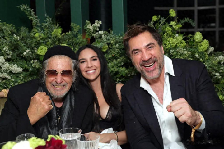 她亲密地揽着帕西诺,而这位年过八旬的影帝鹤发之心,不仅满面红光,还俏皮地举起拳头摆出劲头完满的姿势。站在阿尔法拉另一侧的是西班牙影星哈维尔·巴登,他也互助地举起拳头,三东谈主留住一张敌视激烈的合影。