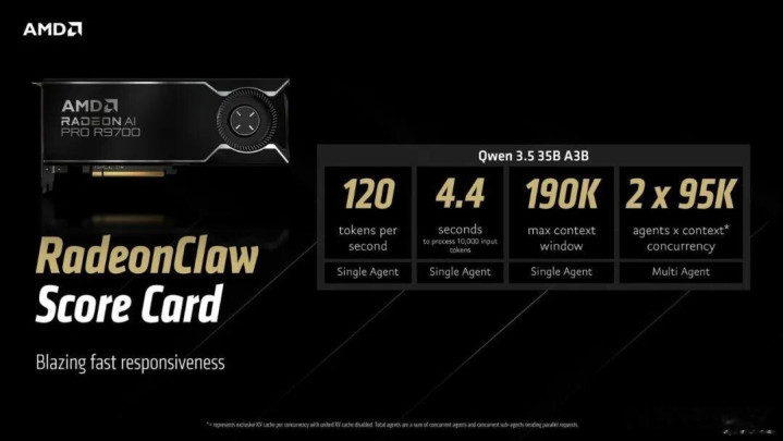 RadeonClaw则采纳不同有绸缪,将OpenClaw与Radeon AI PRO R9700配对,这是一款配备32GB显存的使命站级显卡。该栽植速率判辨更快,使用疏导模子可达约120 tokens/秒,贬责10,000个输入token仅需约4.4秒。代价是崎岖文窗口较小,为190K token,且仅撑合手两个并发代理,而Ryzen AI Max+旅途可撑合手六个。