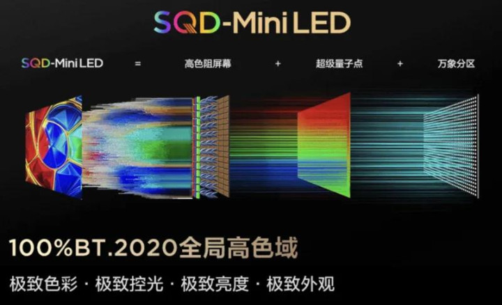 所谓 QD-Mini LED,你不错通晓为 SQD-Mini LED 的基础版,“S”代表Super,指更高亮度和更广色域。这俩的区别是,世俗QD可能只在特定画面下色域高,但 SQD 能作念到全局高色域,无论真切什么画面,色调齐不缩水。