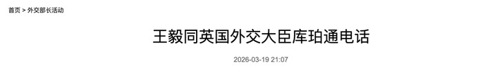 2026年3月19日,中共中央政事局委员、酬酢部长王毅应约同英海酬酢大臣库珀通电话。两边重心就中东场面交换意见。