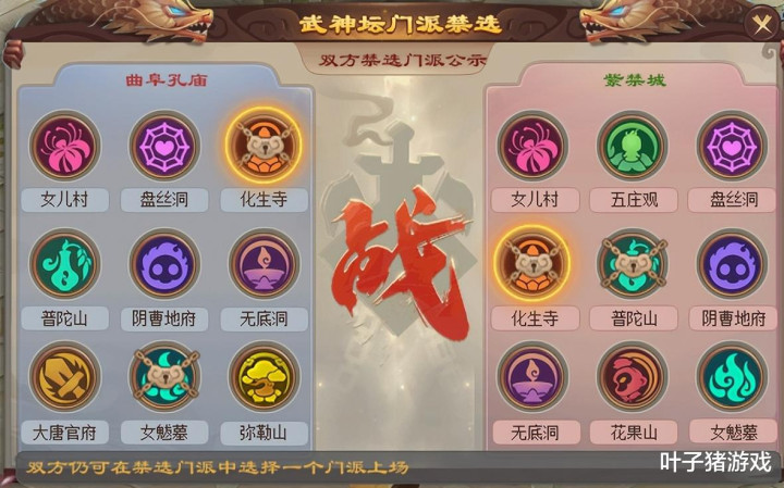 在禁选尺度,紫禁城为铁心曲阜孔庙声势的法系输出,取舍禁用女魃墓与化生寺;而曲阜孔庙则针对紫禁城的五保零声势,禁掉化生寺和普陀山。紫禁城为使用打蓝声势,回生了普陀山;曲阜孔庙则为了打后期,取舍回生化生寺。