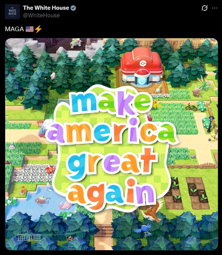 由于这波二创太火了,遵守白宫也来凑这个吵杂,他们在推上发布了一张有着《宝可梦Pokopia》作风的特朗普标语图。