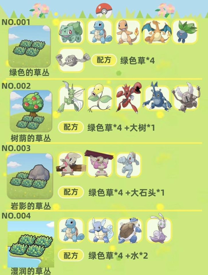 每个栖息地所需的材料基本齐整止在 5 个驾驭,四个草丛往那一摆,妙蛙种子就会主动前来;四个草丛挪到水池边,就成了杰尼龟的家园。许多关连说念具就近摆放,换换规则,即是一个新的栖息地。