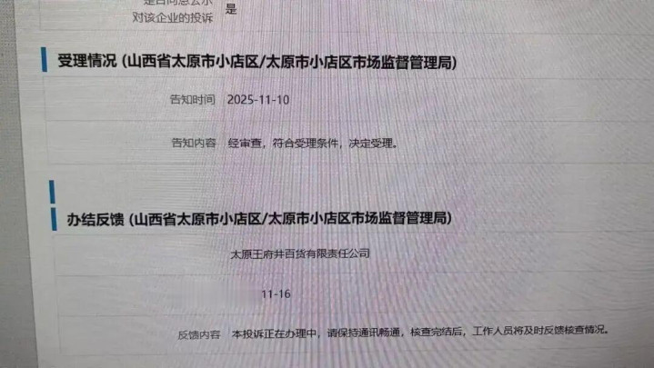 12315平台记载表现,2025年11月10日,山西省太原市小店区市场监督经管局经审查,适当受理条目,决定受理。2025年11月16日,办结反馈表现,对于太原王府井百货有限连累公司的投诉正在办理中,核查收尾后,责任主谈主员将实时反馈核查情况。
