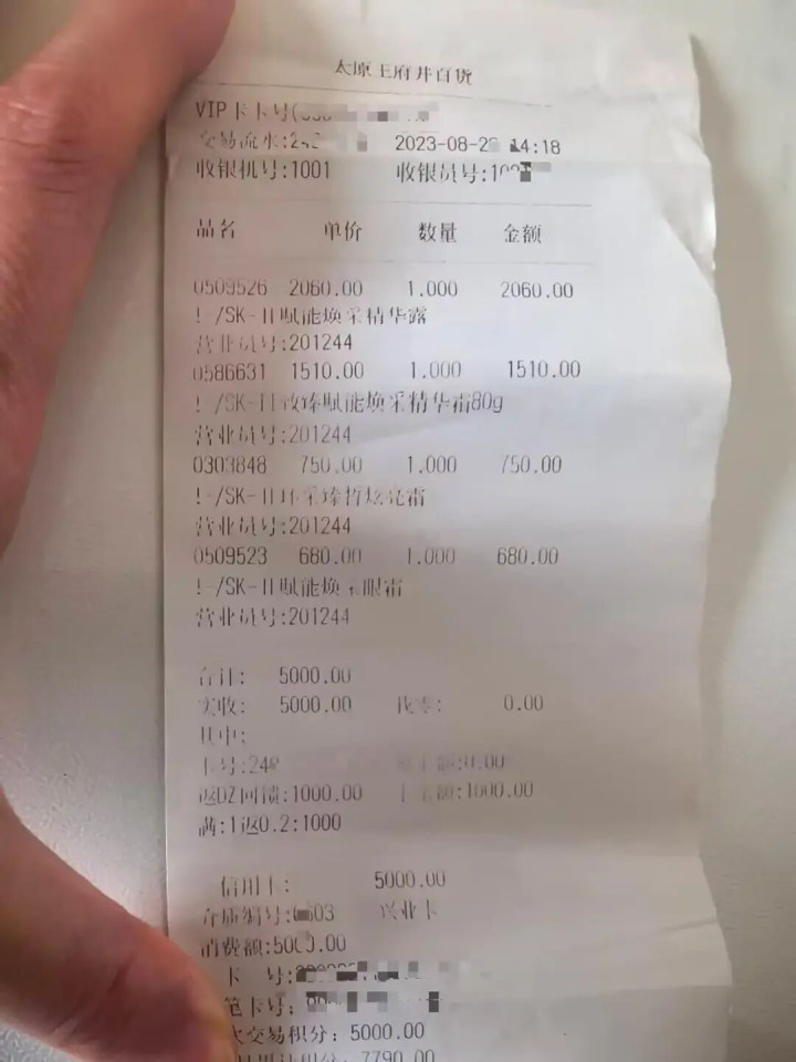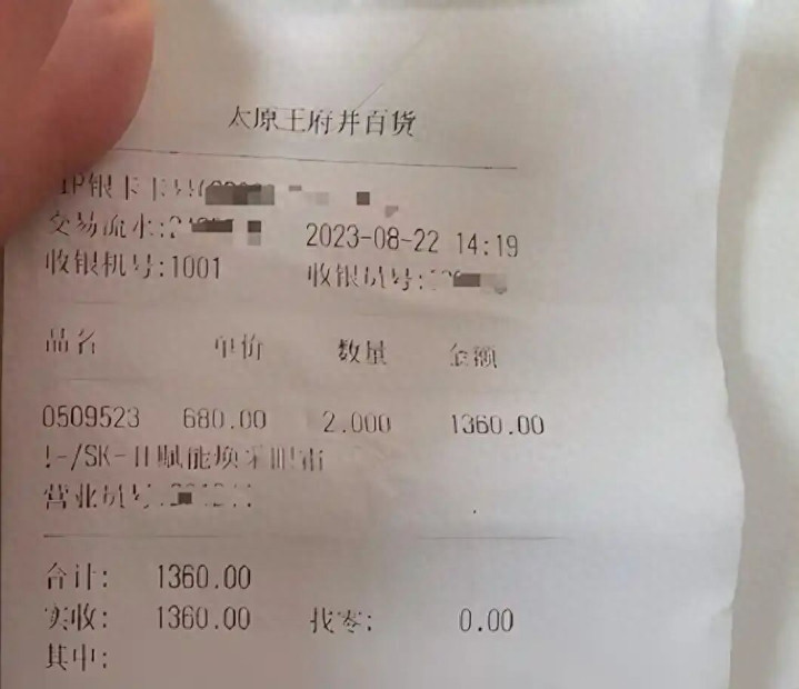2023年8月22日,张女士在山西省太原市亲贤街的太原王府井百货购买了价值6000多元的SK-II居品,其中包括3瓶眼霜,单价680元/瓶。