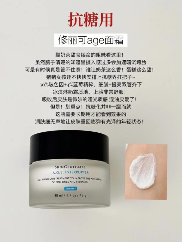 看成修丽可6年真爱粉,掏心窝保举这瓶,AGE面霜一定是抗老谈路上值得信任的伙伴。领先它背靠因素大佬品牌,浓度技巧皆在线,除了淡纹它更出彩的是抗糖,皮肤更不易暗千里。