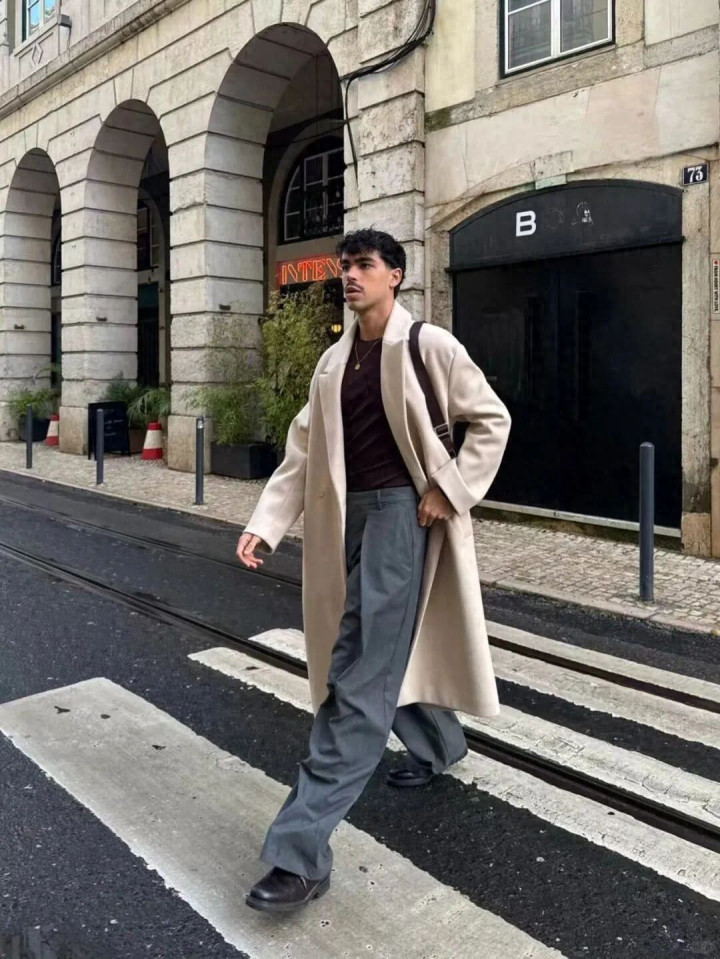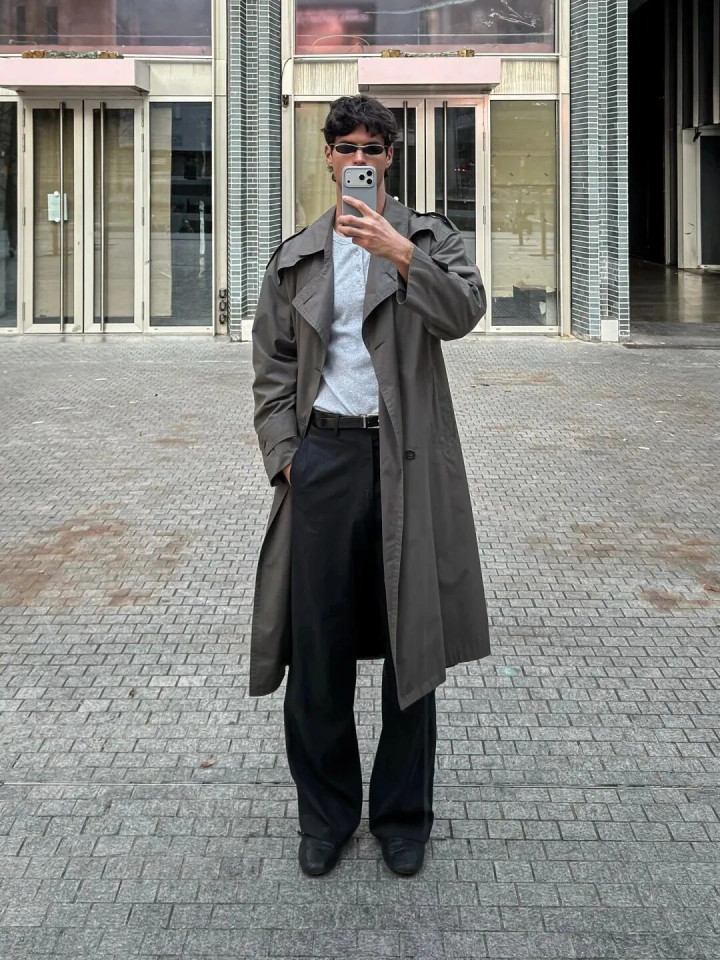 比及天气稍许回暖,薄少量的风衣就要登场了。这时,西装裤的聘请范例只好一个:垂坠感。那种走起路来微微回荡、不留褶皱的面料,能霎时拉长你的腿部线条。