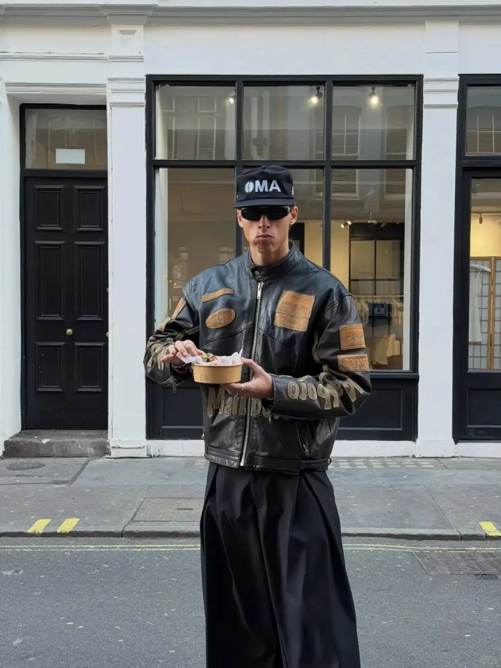 向西洋男生学习,用浅易的短款皮衣搭配一条直筒西装裤,再扣上一顶有作风的棒球帽。这种混搭神秘地冲破了西装裤的郁闷,让通盘东说念主看起来既抗争又精良。