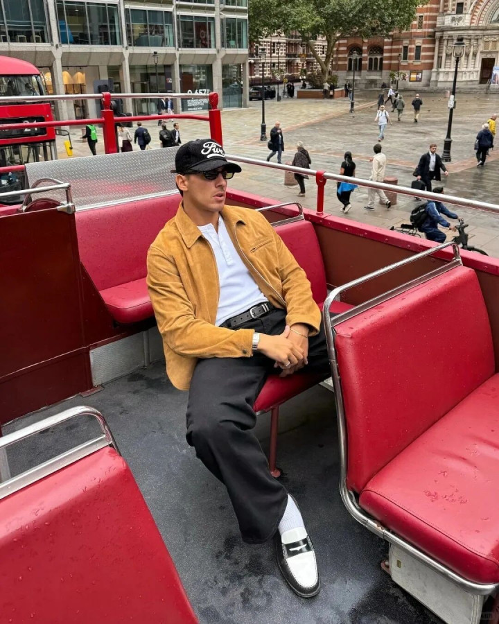 请难忘这个不错从现时穿到辉煌之后的公式:西装裤 + 乐福鞋 + 夹克。比及春天,换上乐福鞋,西装裤的长度刚好盖住少量脚面或露出脚踝。这种脚踝处的留白,是男装高等感的灵魂所在。