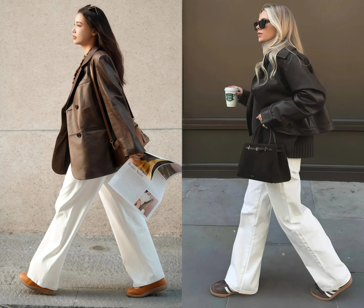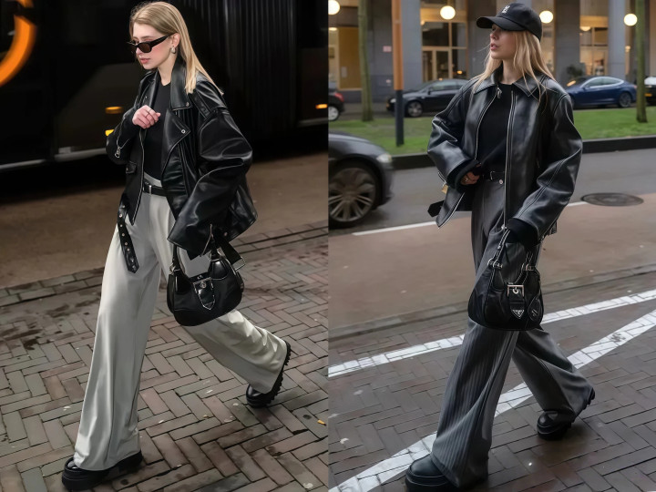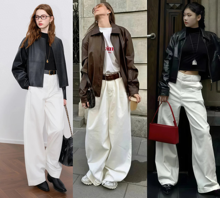 譬如说经典的皮衣配牛仔裤,即是帅气的机车风,可当你把下装换成阔腿裤的时候就不相似,穿上死后,迅速就切换成了闲适风。
