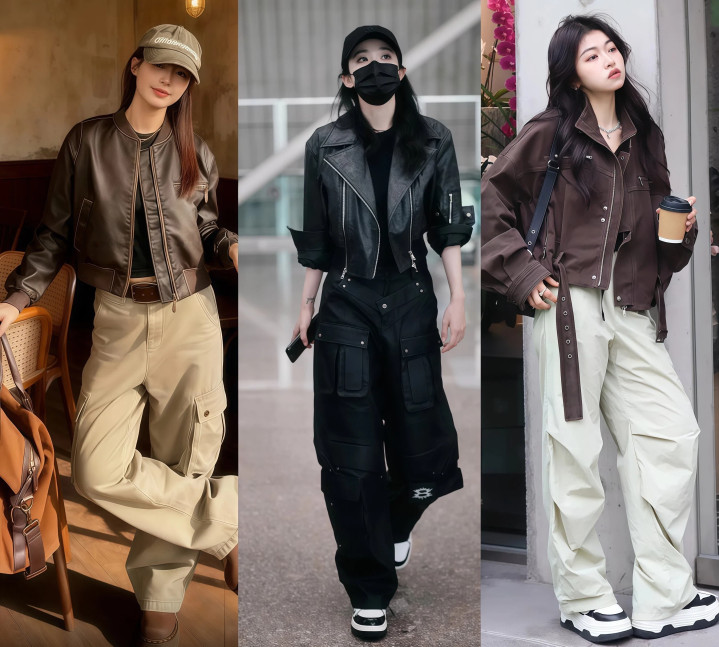 想走街头道路就选这套,工装裤配上皮衣的硬朗质地,酷得很透顶。格式选基础色,百搭不挑东说念主,也不错选军绿色和卡其色,和玄色皮衣的颜色对比显着但不蹂躏。