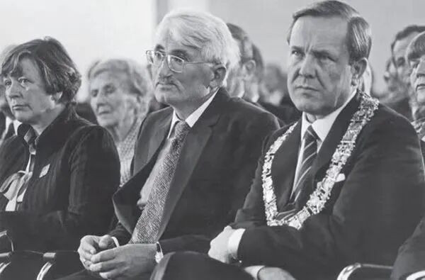 1980年,哈贝马斯(中)在好意思茵河滨法兰克福保罗教堂举行的阿多诺奖授奖庆典/图源:《于尔根·哈贝马斯:常识分子与群众生活》