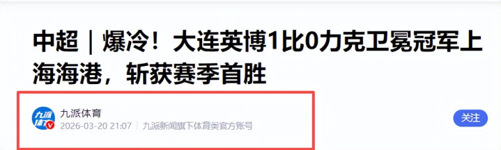 九派新闻2026-03-20《中超|爆冷!大连英博1比0力克卫冕冠军上海海港,斩获赛季首胜》