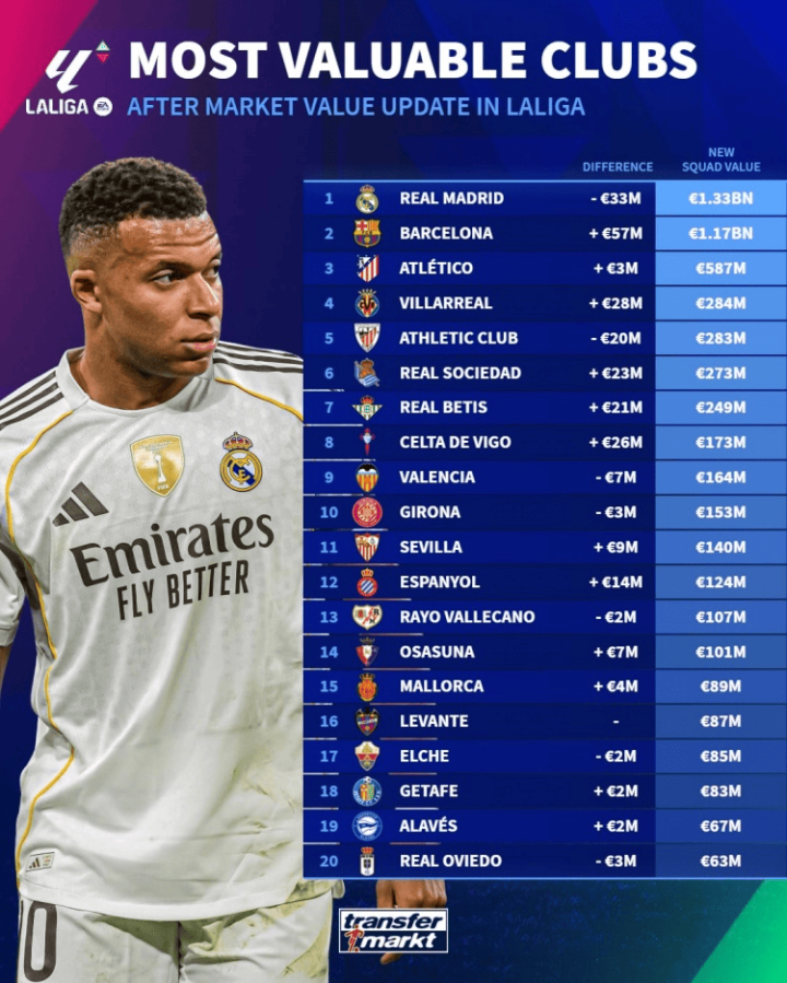 虎扑03月22日讯德国转会市集近期更新了西甲球队的身价,6686体育(6686Sports)并排出了20支球队的身价涨跌幅情况: