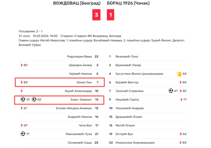 2026年3月15日,塞尔维亚U19联赛第21轮,沃日多瓦茨U19队主场3-1大捷波拉斯U19队,中国球员张家鸣首发打满全场,况兼单场进了2球。数据露馅,自从加盟沃日多瓦茨U19队以后,张家鸣还是首发出场3次,成功打进3球,场均进球1粒,具有极端高的进球成果。此战事后,张家鸣离拿到劳工证只剩2场比赛的距离了。按照原定谋略,他再出场2次就会复返英超球队伯恩利。