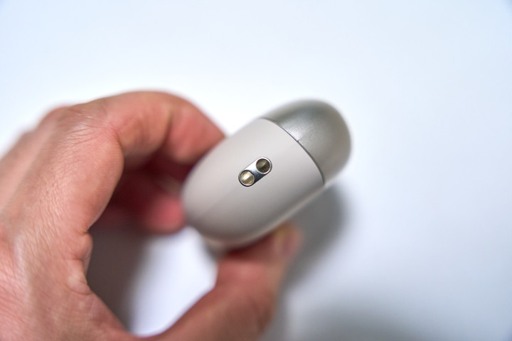 充电仓外壳是双拼材质,上半部分高光亮面普及质感,下半部分类肤质硅胶增强抓持摩擦力,闲居使用无彰着指纹残留。